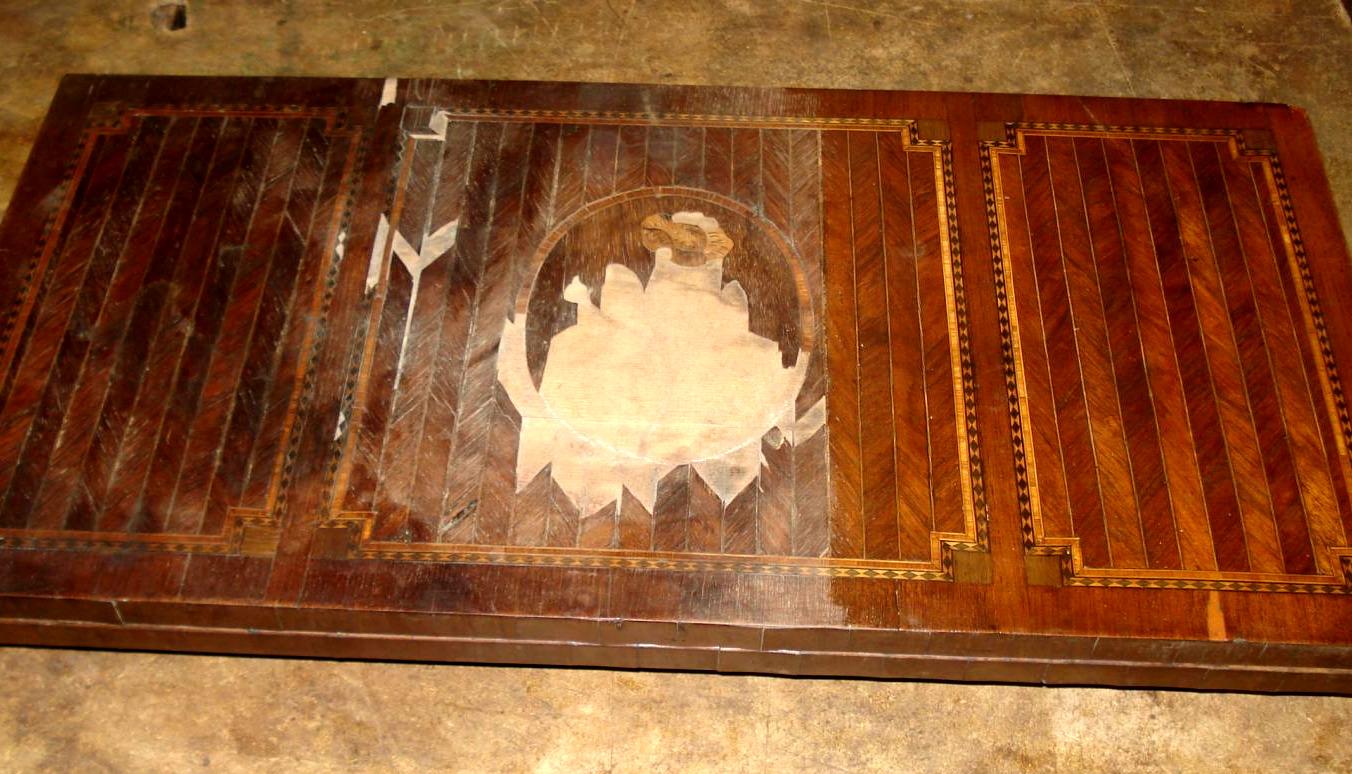 Utilisation de la technique sous vide d’air pour les collages de surfaces galbées, ainsi que pour la dépose et repose de marqueteries lors de restaurations de panneaux plaqués détériorés (fentes, manques, déformations dues au temps passé).